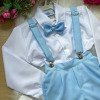 TECIDO CAMISA 100% POLIESTERTECIDO DA CALÇA: 100% POLIESTER Conjunto composto por: Camisa Social na cor Branca, Gravata Borboleta na azul bebe, Calça azul bebe e suspensorio azul bebe Demais peças ou acessórios, não inclusos. BATIZADO,PAGEM,NOIVINHO